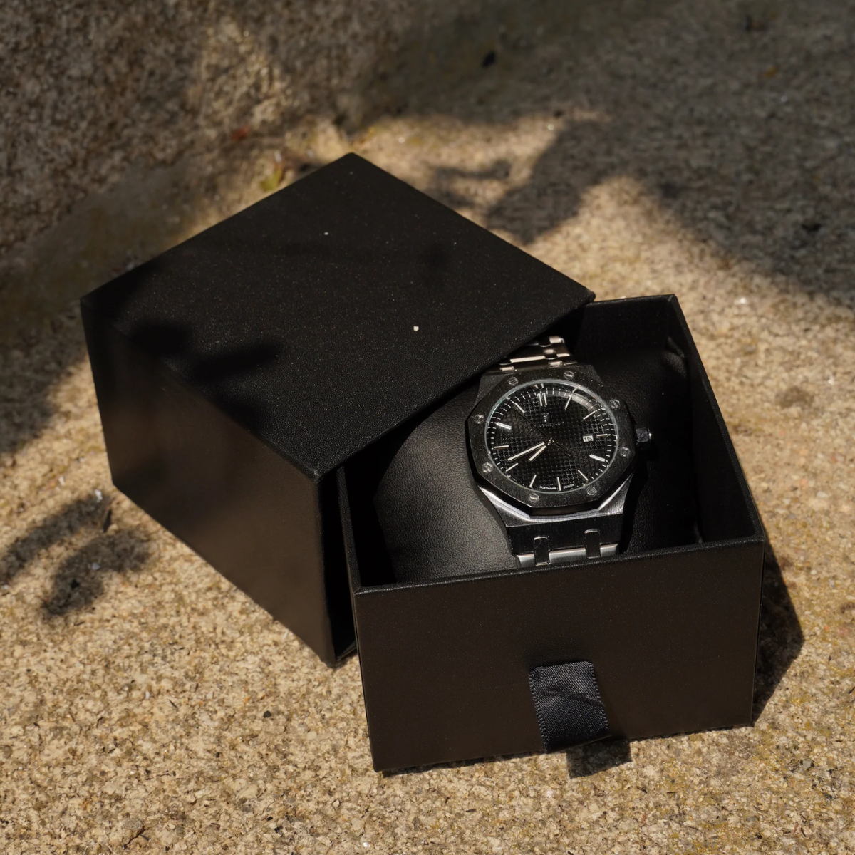 Bitte beachten Sie: Das Armband der Uhr hat einen etwas anderen Farbton als das Zifferblatt und die Schachtel, was einen subtilen Kontrast erzeugt.