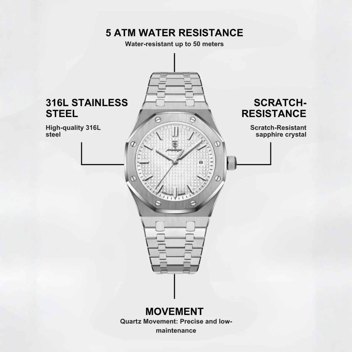 • Gewicht: 130 g – solide Präsenz am Handgelenk
